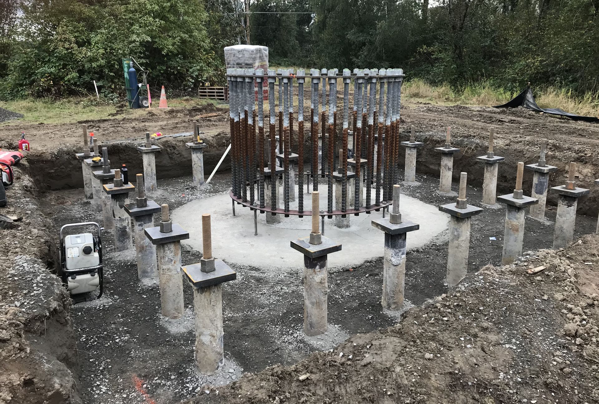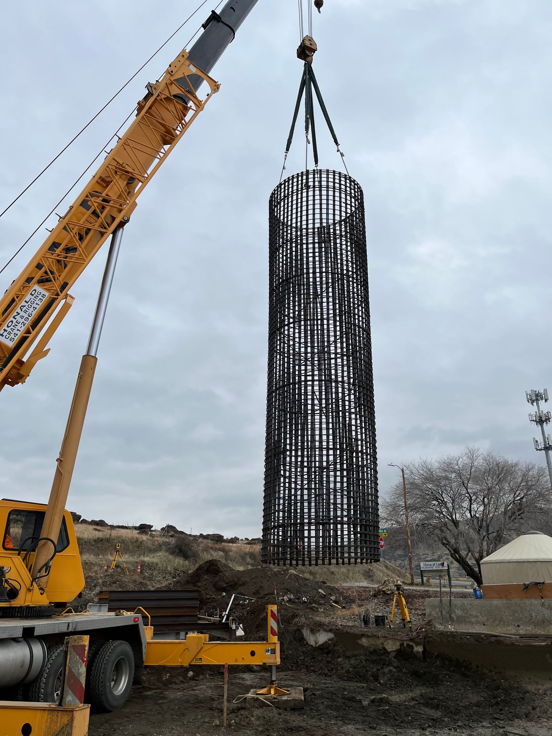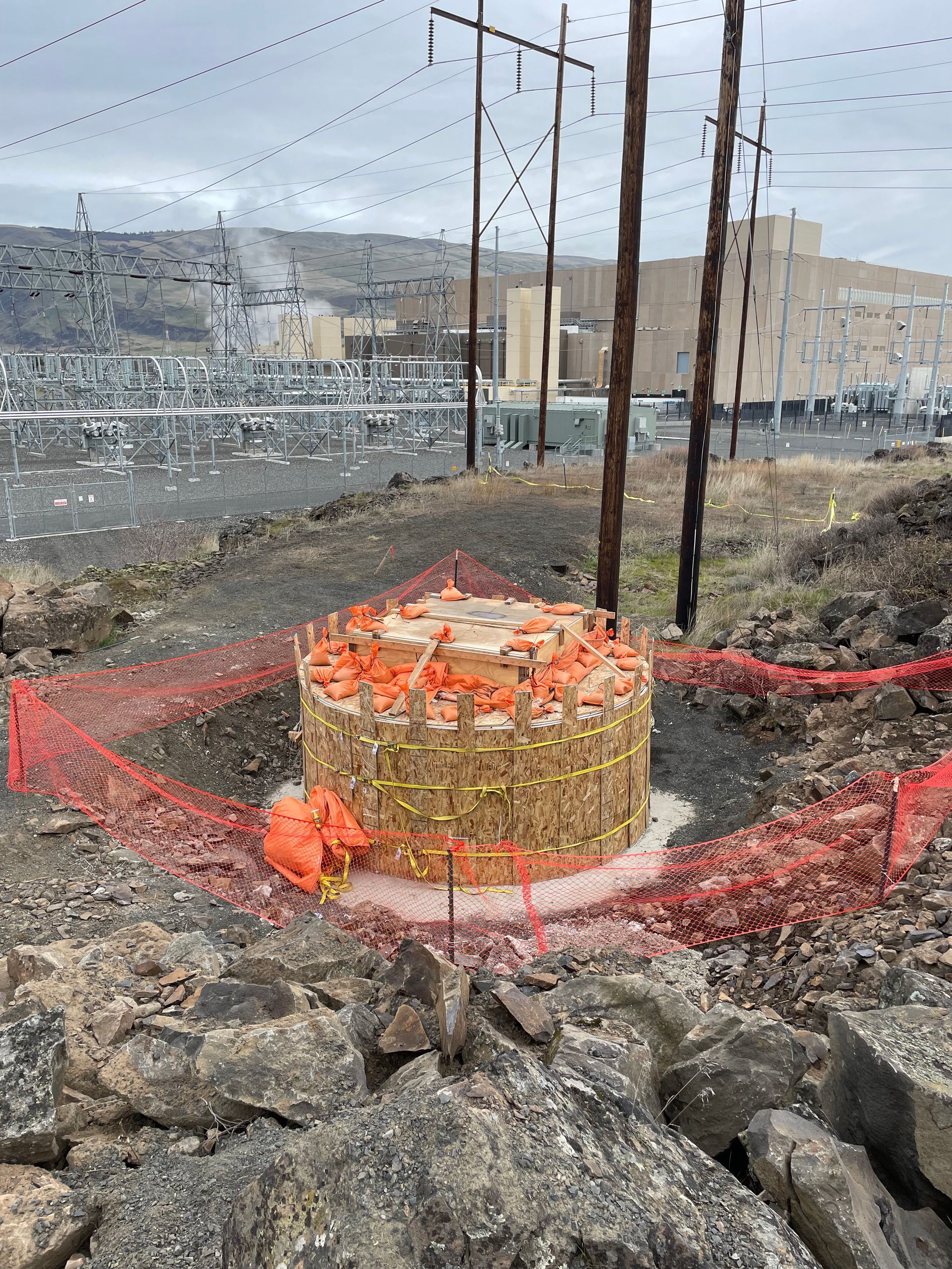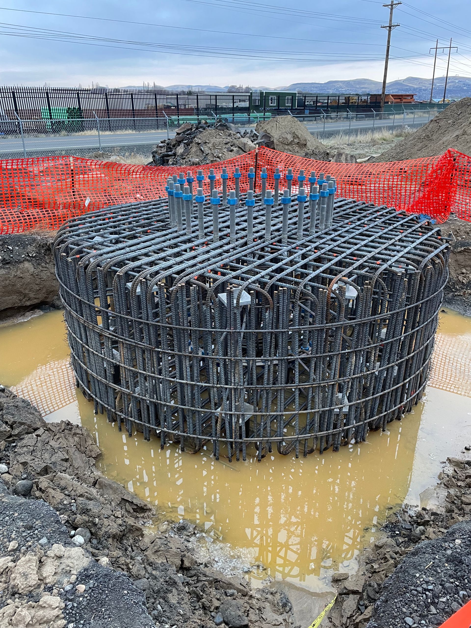 Installed (15) Transmission structure foundations comprised of a mixture of drilled pier and micropile with concrete cap. Drilled pier foundations ranged in size of 8’ to 10’ in diameter up to 38’ deep. Micropile counts from 12 to 20 per structure with concrete caps in size of 15’ to 22’ in diameter and up to 7.75’ thick. Unique project challenges included subsurface conditions of basalt bedrock with strengths over 20,000psi, round pile caps created challenges with rebar installation, concrete pile caps required thermal control plans for mass concrete pours.