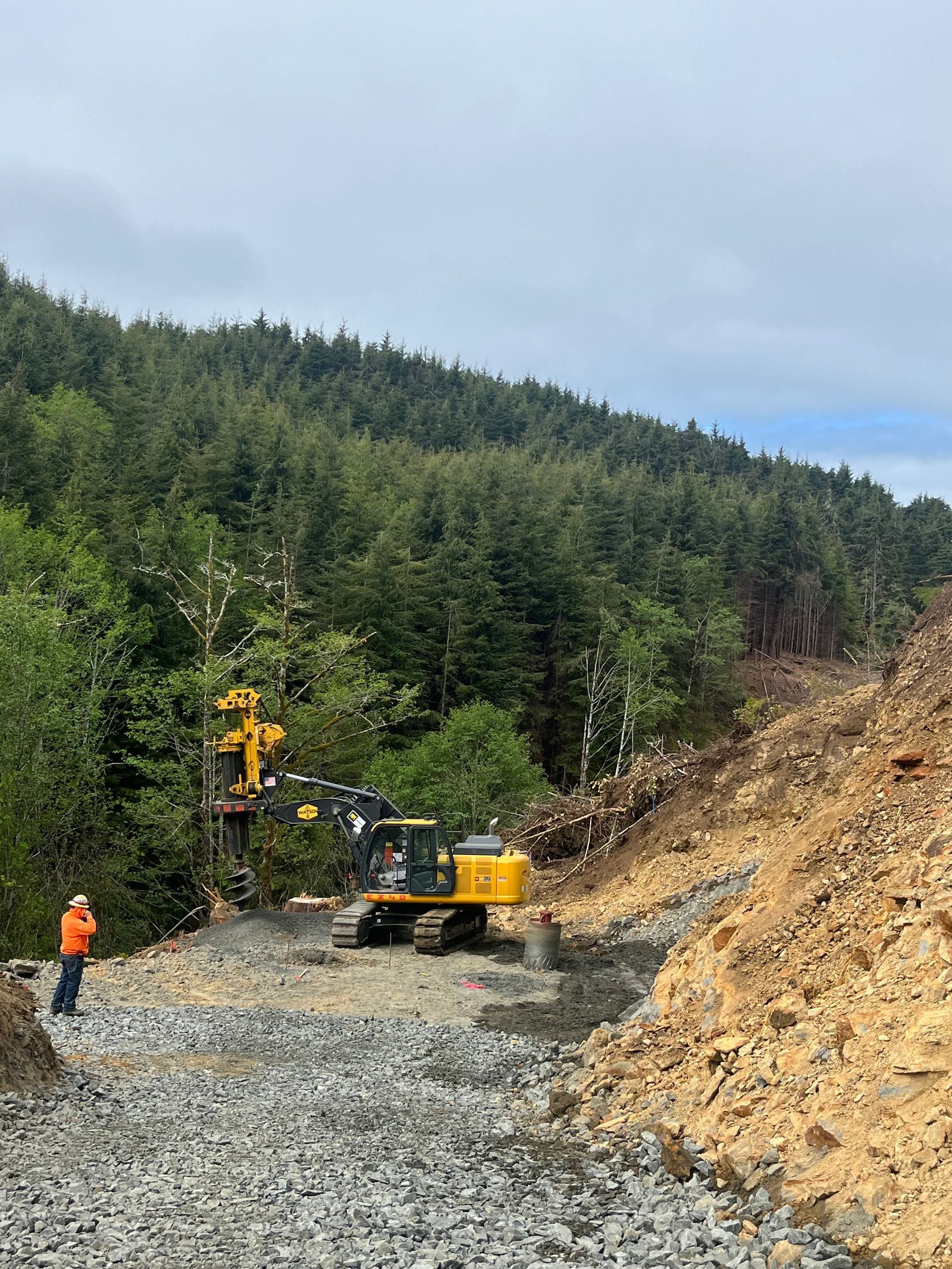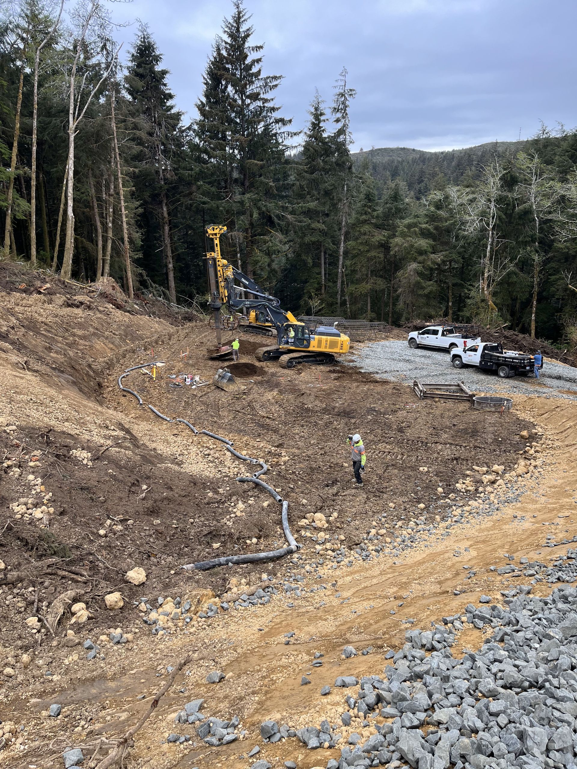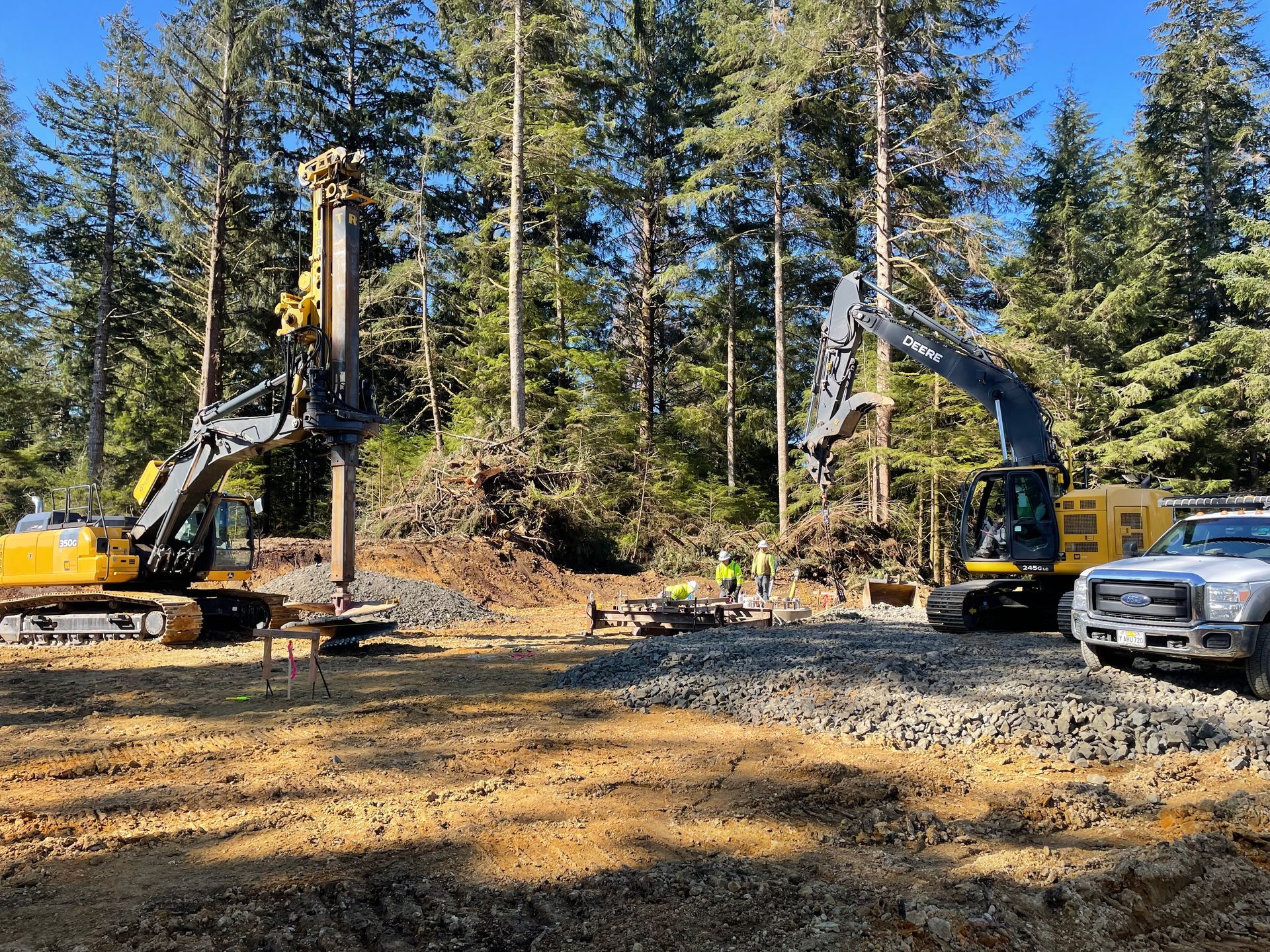 Installed (6) drilled pier foundations for new transmission line. Drilled pier size for all foundations was 6.5’ diameter x 21’ deep. Drilled pole and anchor holes through rock. Project challenges included steep terrain, long travel times for concrete, wet working conditions in rainy Oregon coastal mountains, having to pump concrete 600’ down a hill because access roads were too steep for a concrete truck.