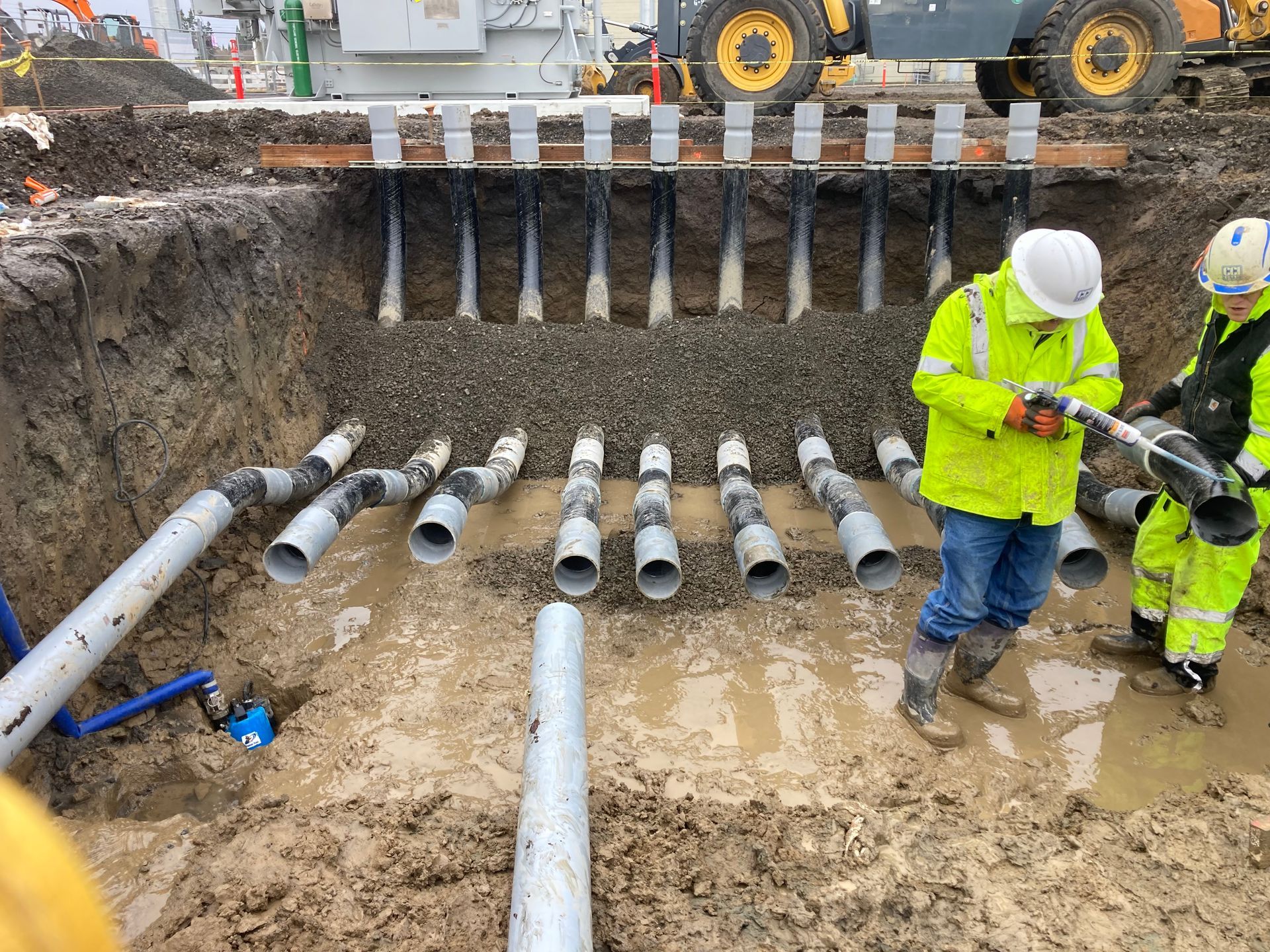 Installed foundations, CMPs for direct embed steel poles and drilled pole holes for wood poles. Foundations included mixture of drilled piers and micropile w/ concrete cap. (9) drilled pier foundations at 6’ to 7’ diameter up to 25’ deep. (2) micropile foundations with (28) individual micropiles in each foundation with 21’x21’x6’deep square concrete cap. (12) CMPs for direct embedded steel poles, 4.5’ to 5’ diameter up to 18’ deep. (95) wood pole holes. Project challenges included work along highly traveled roadways, varying ground conditions including large boulders and caving soils, thermal control plan and procedures for mass concrete pours on micropile caps including ice being added to concrete mix to bring overall temperature down at time of placement.